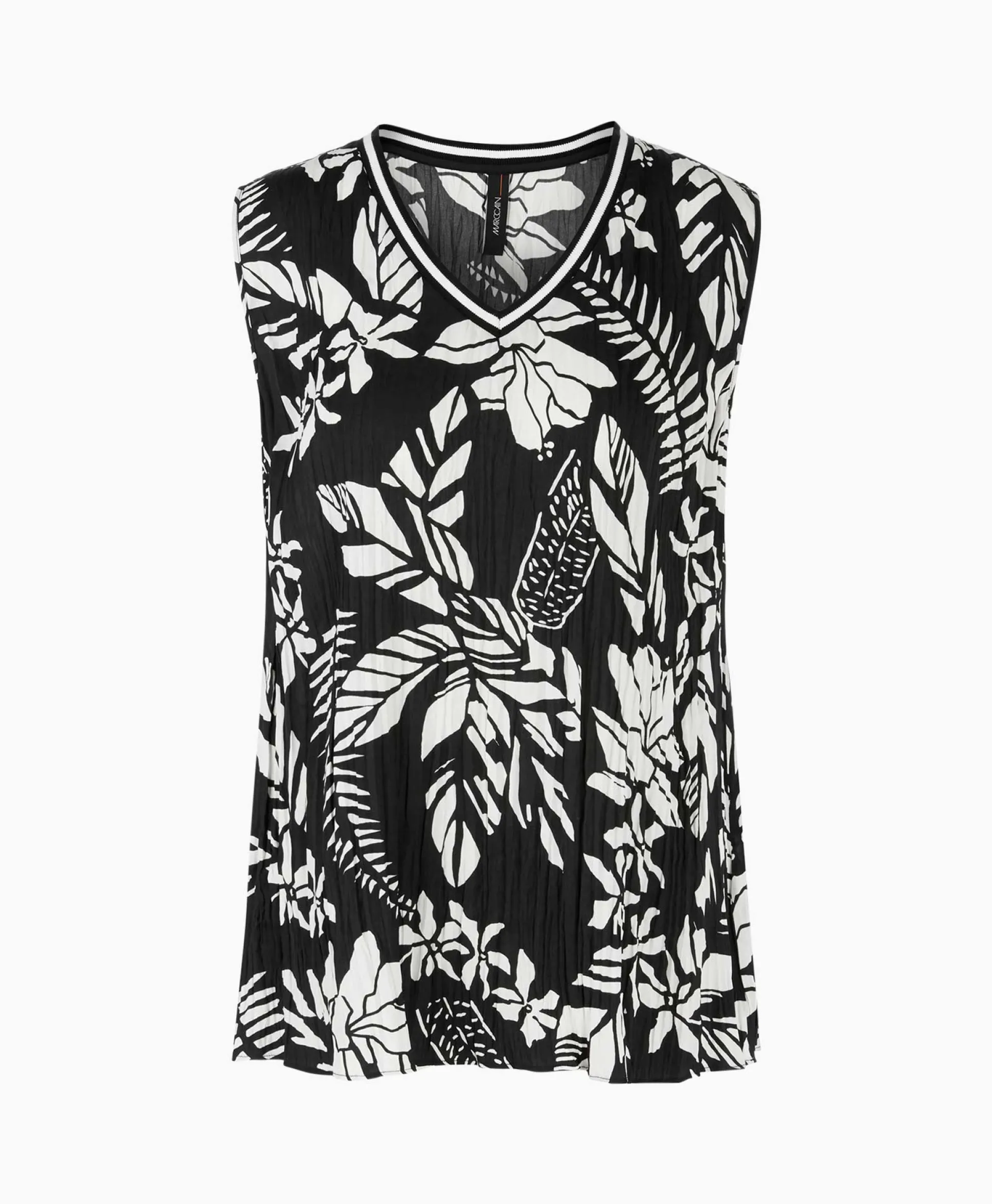 De Top Is Van Luchtig Licht Weefsel. Hij Is Geplisseerd En Naar De Zoom Toe Wijd Uitlopend. De Florale Print Wordt Geaccentueerd Door De Gestreepte Gebreide Ribbels Bij De V-Hals. De Armsgaten Zijn Afgezet Met Een Paspel. Het Model Is 179 Cm Lang En Draagt Maat N3 / 38. Materiaal: 88% Viscose, 12% Elastaan, 100% Polyester.